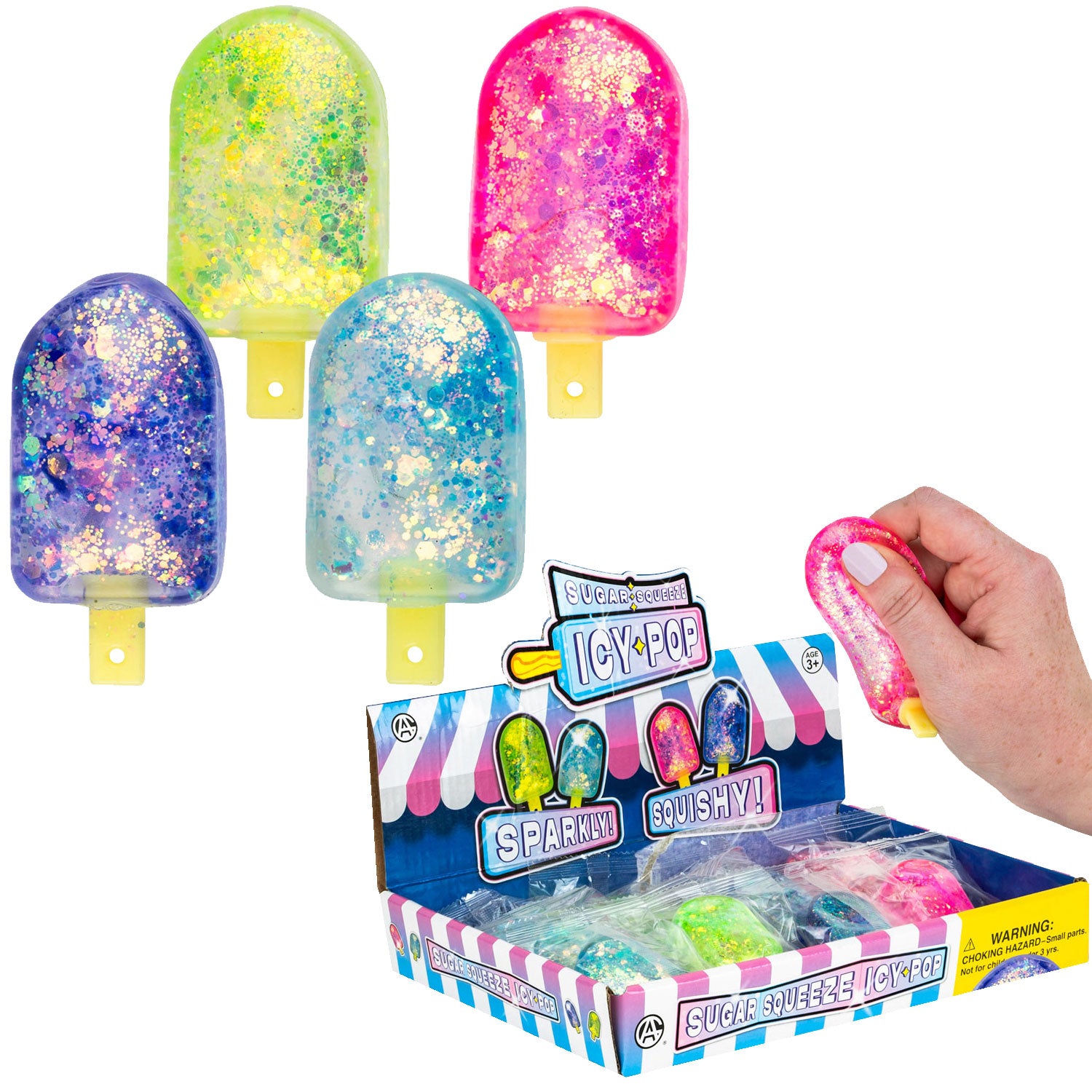 2 1/2 inches long. Squishy multi colored glittery popsicles. Individually bagged. Display box. Sold by the dozen.